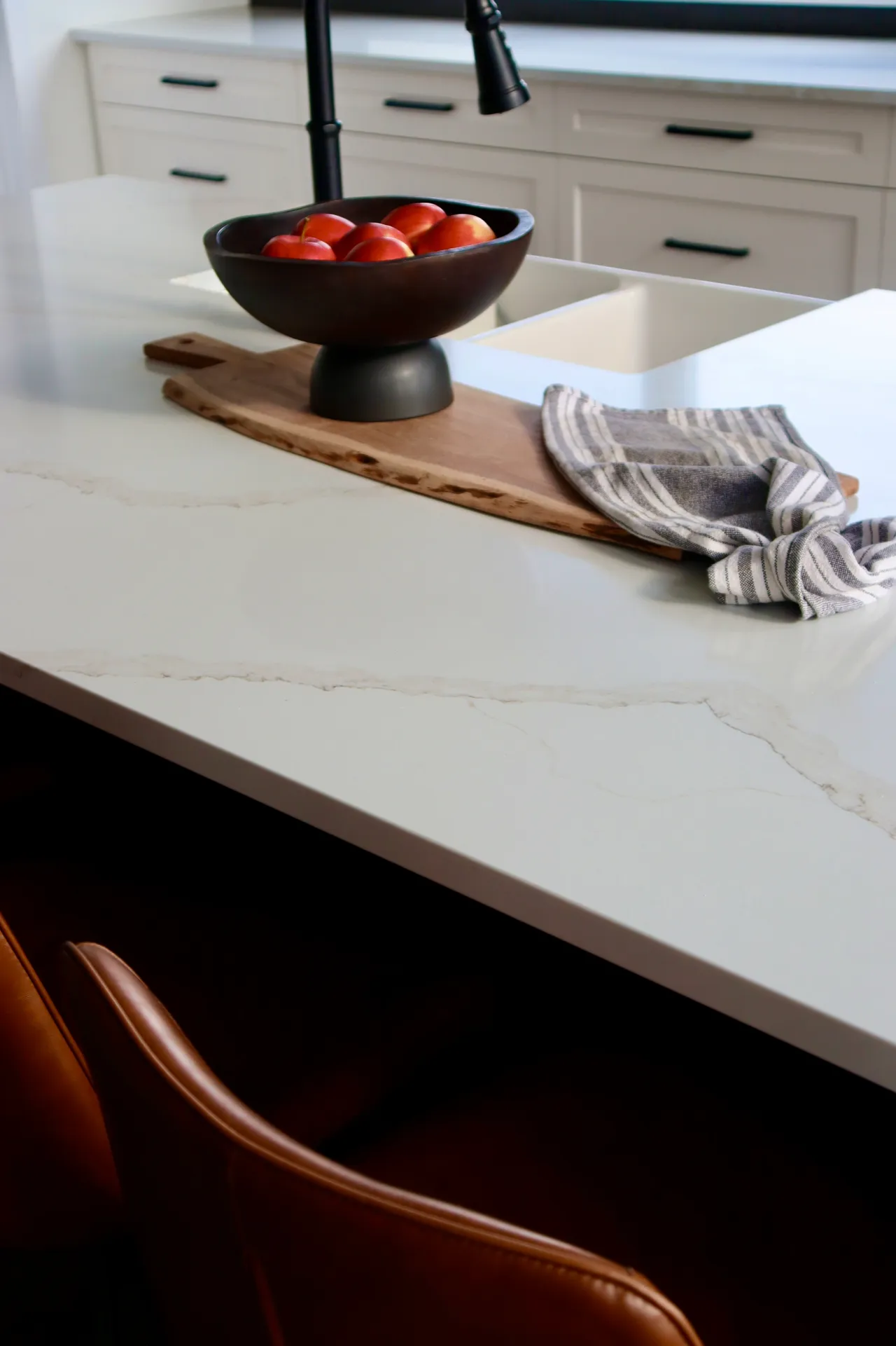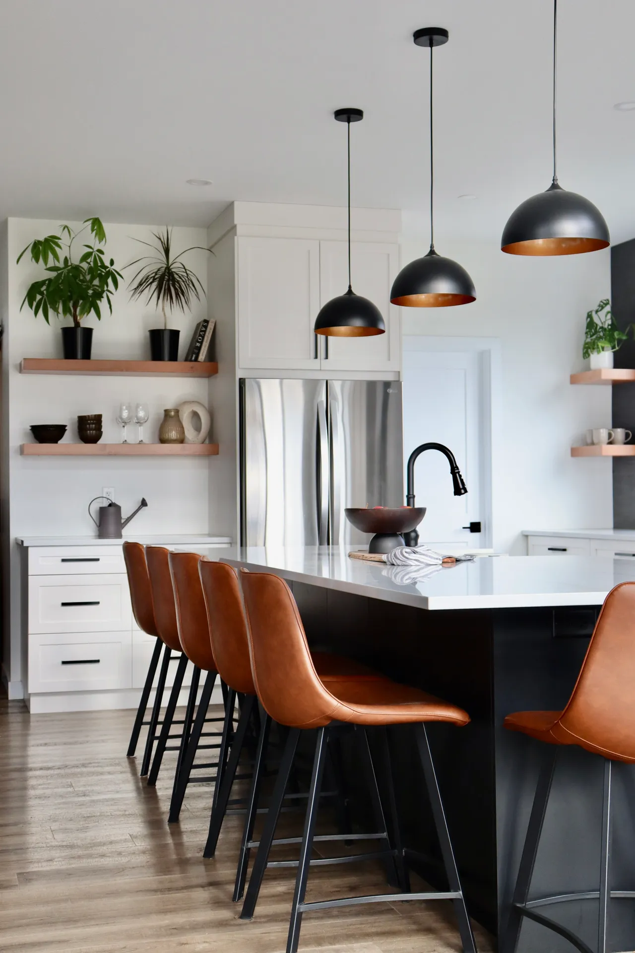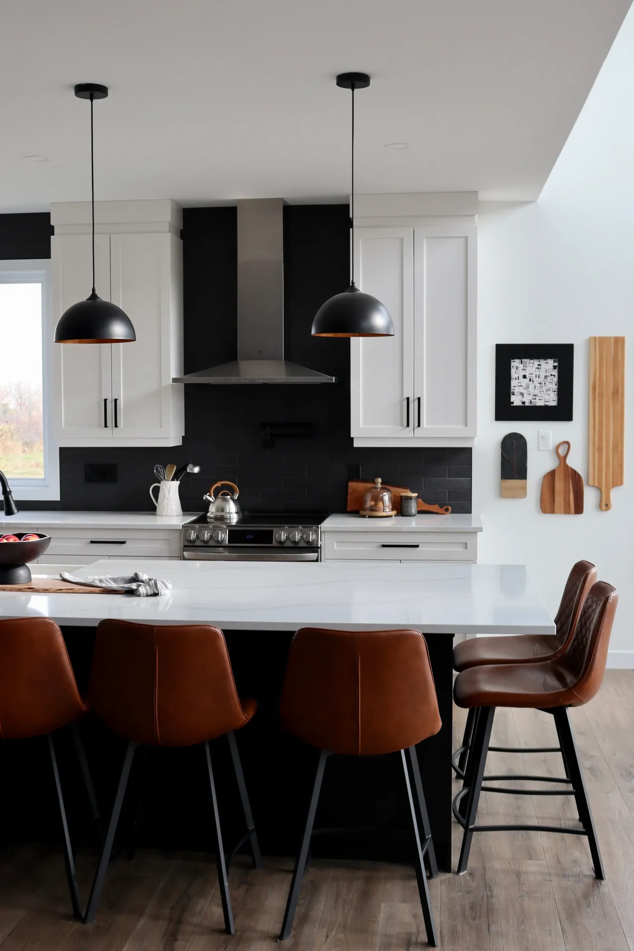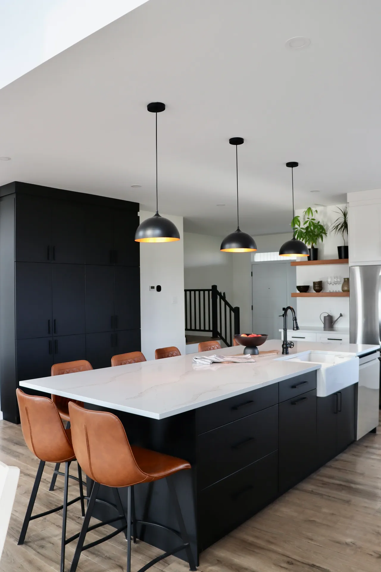 This kitchen features two tones of cabinetry. The combination of a matte black island and pantry, paired with surrounding white cabinetry adds depth to the space. The “Calacatta gold” quartz countertop balances out the contrast of the kitchen, with coloured veining sweeping throughout the slab.