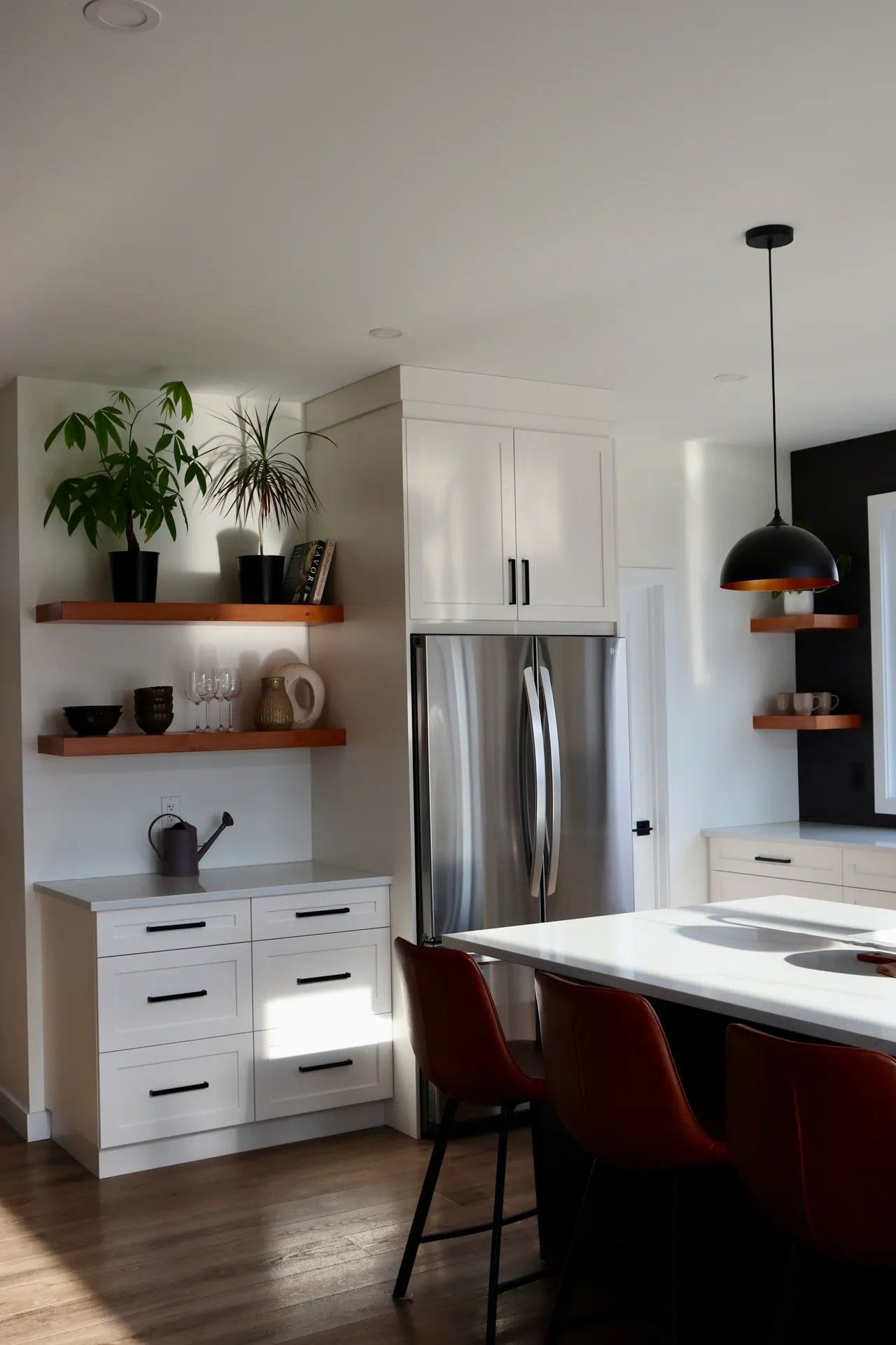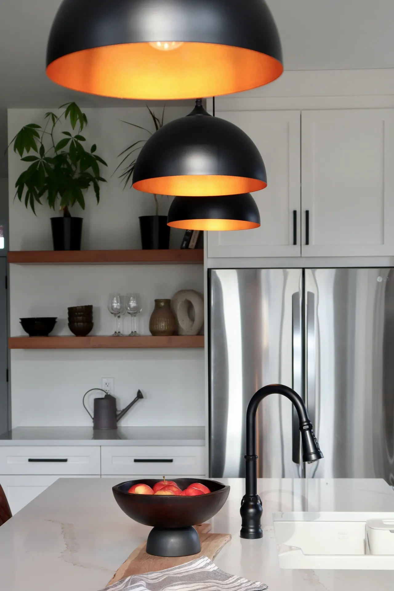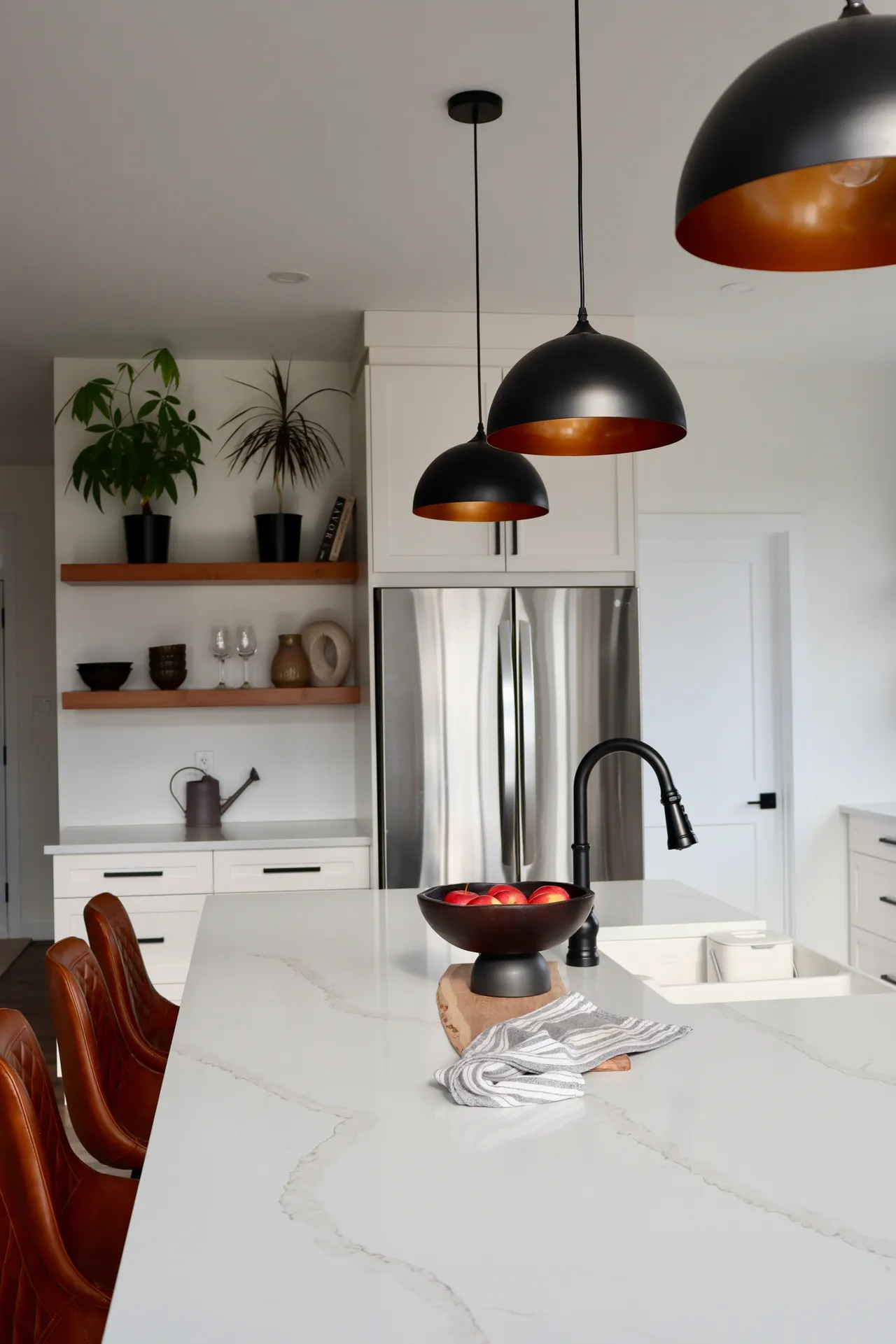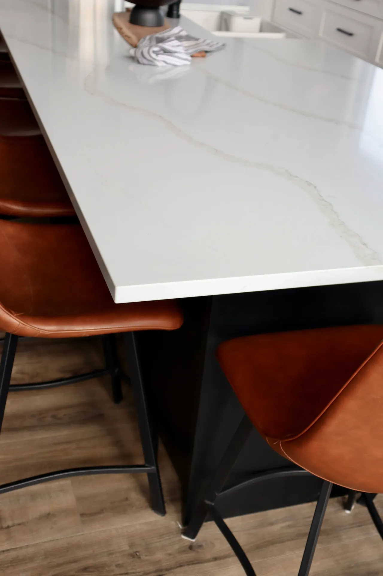 This kitchen features two tones of cabinetry. The combination of a matte black island and pantry, paired with surrounding white cabinetry adds depth to the space. The “Calacatta gold” quartz countertop balances out the contrast of the kitchen, with coloured veining sweeping throughout the slab.