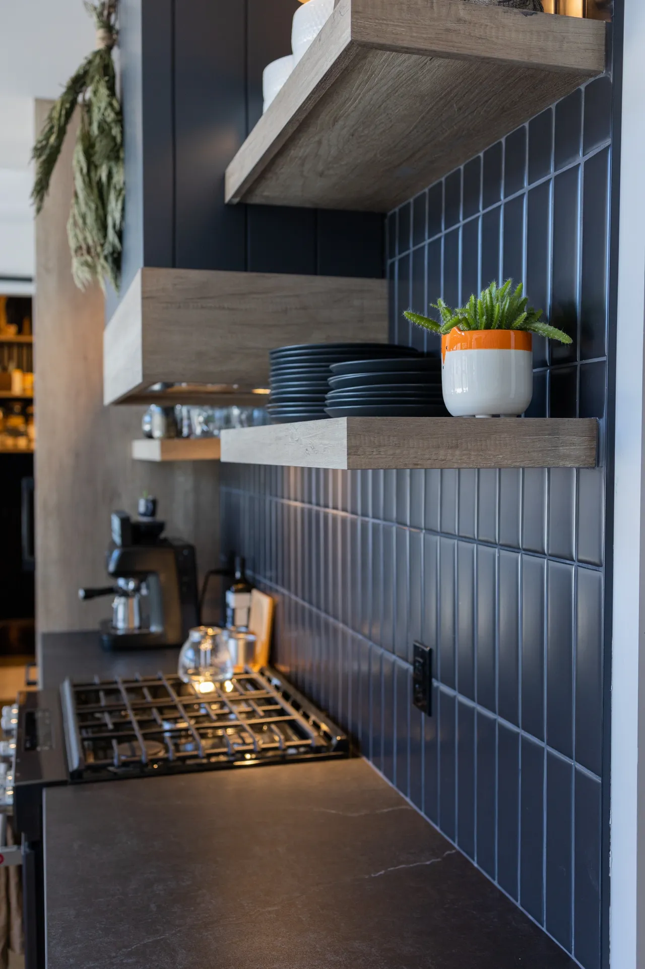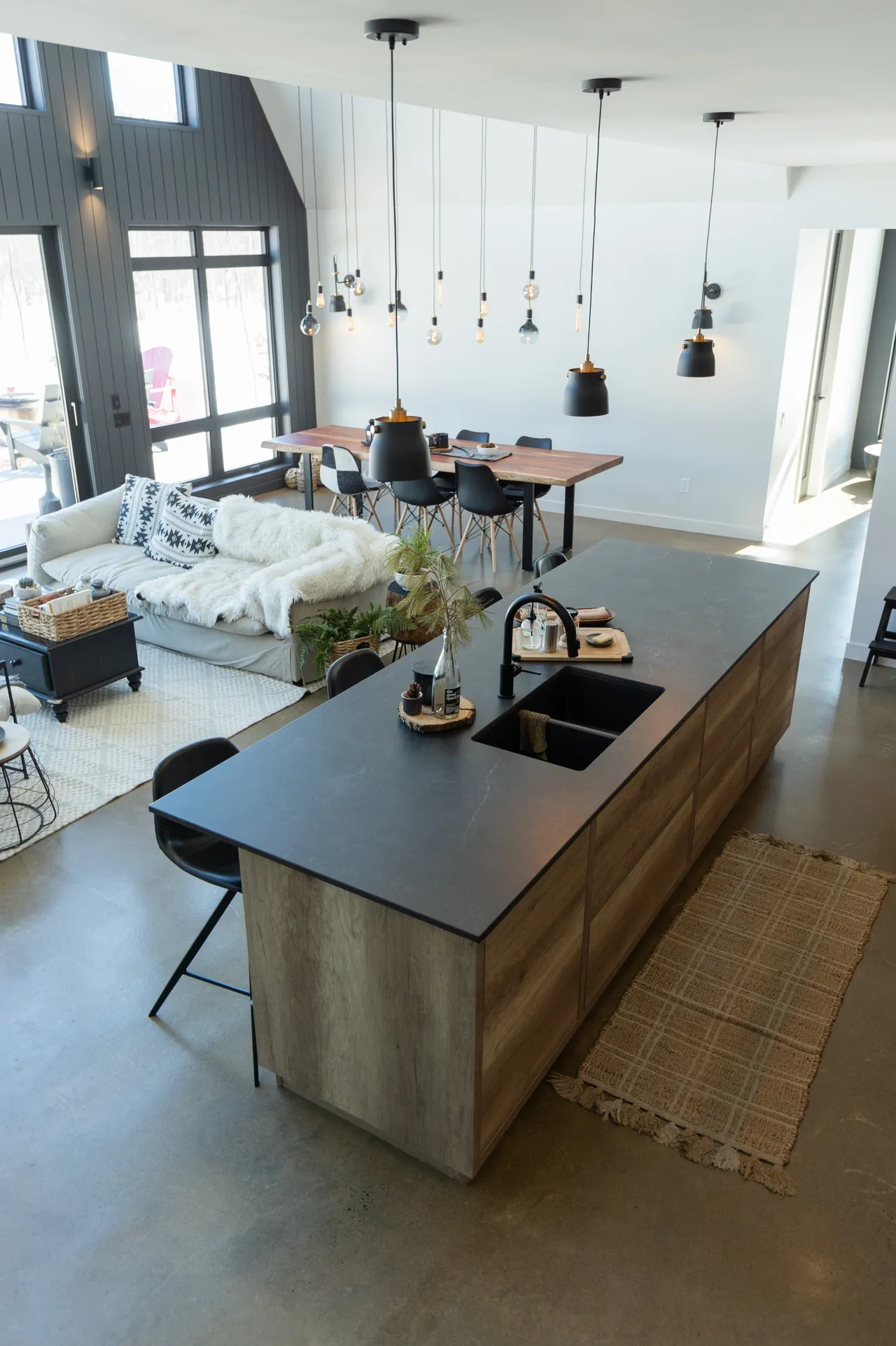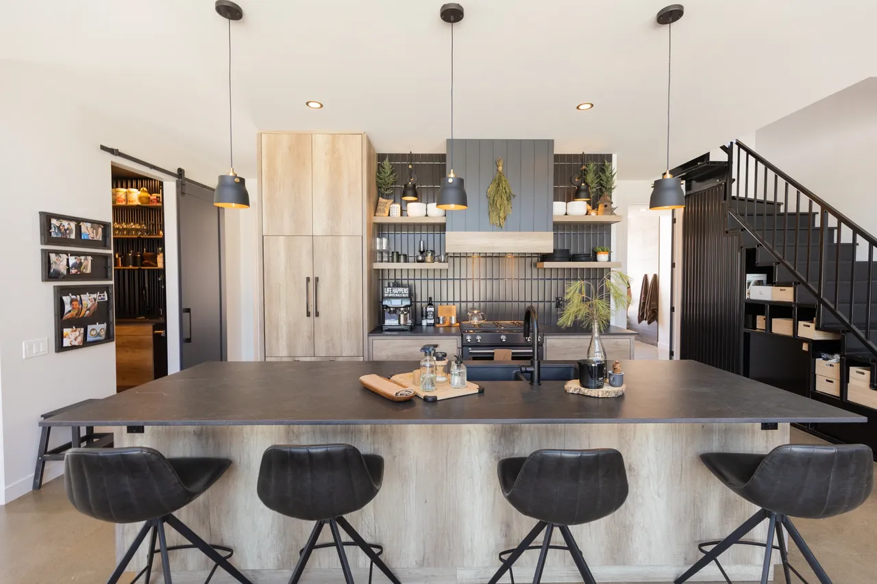 This modern kitchen blends sleek black accents and contemporary oak cabinets for a warm “cabin like” aesthetic. The fridge is camouflaged with custom panels and the center island stays functional with push to open doors.